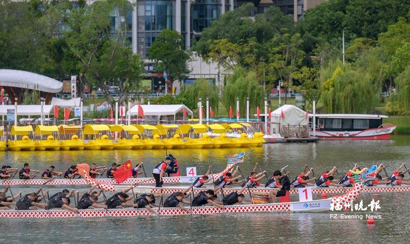 就在这“醉美”赛场上,各支龙舟队展开了激烈比拼。“各队注意!预备——划!”1日上午,随着这声口令一次次发出,晋安湖湖面一次次沸腾,龙舟如离弦之箭冲出起点,队员们的号子声打破了湖面的宁静。龙舟之上,船头鼓手身姿挺拔,鼓槌落下,传出富有节奏的“咚咚”声。龙舟高速疾驰,周围的国旗迎风飘扬。