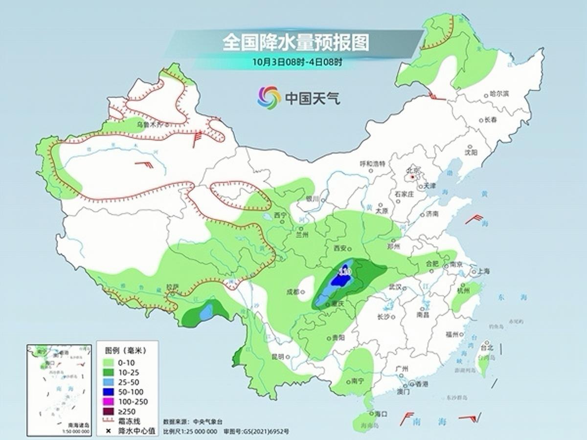 10月3日,西藏东南部、西北地区东南部、江汉西部、西南地区东北部等地部分地区有中到大雨,其中,陕西南部、四川盆地东北部、重庆东北部等地部分地区有暴雨或大暴雨。