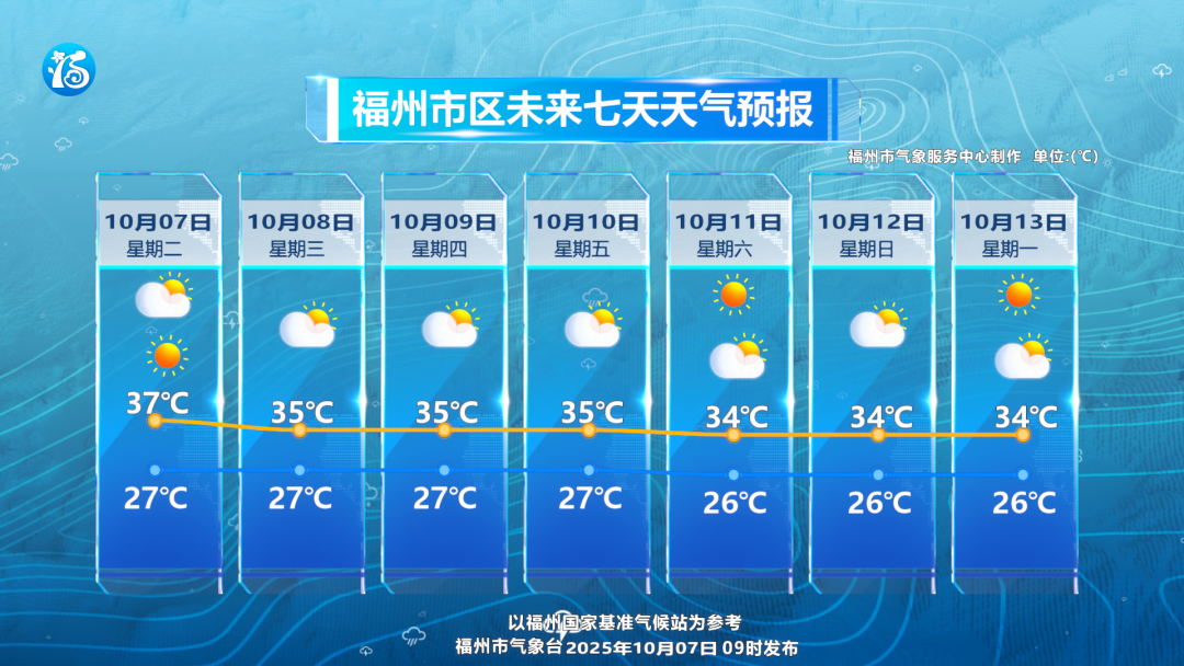 在强盛副高的控制下,假期的尾声将会在晴热高温中度过并在假期后延续,降雨稀少。7日最高气温可达37℃,未来三天高温略有缓解,但福州市区最高气温还会维持在35℃高温线上下,体感炎热,假期出行需做好防暑降温的措施。同时近期降雨稀少,森林火险气象等级高,请注意用火用电安全。