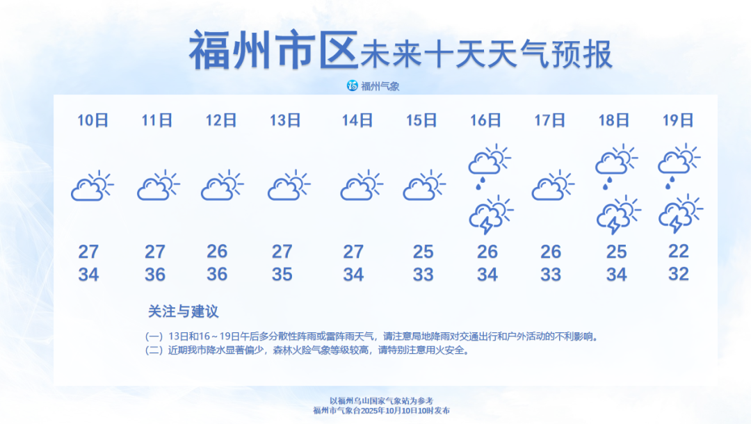 天气:未来十天福州仍以多云天气为主,其中13日和16~19日,午后部分乡镇有阵雨或雷阵雨。