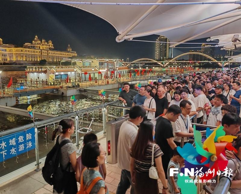 国庆中秋假期,闽江夜游游客流量大增,等待上船的游客排起长队。(八方客运公司供图)