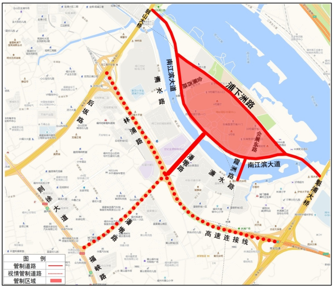 2025年10月16日7:30至12:00,对南江滨大道(魁浦大桥桥下至鼓山大桥桥下)、浦下洲路(以上均含本路)组成的围合区域内道路,潘墩路(林浦路路口至南江滨大道路口)、霞洲路(南江滨路口至濂水路口)实行交通管制,禁止机动车(持专用通行证车辆以及周边单位、小区车辆除外)通行,禁止非机动车、行人(持专用证件人员除外)通行,地铁4号线会展中心站仅允许专用证件人员出站。