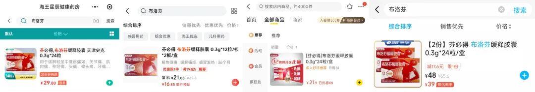 同规格的布洛芬,海王星辰门店、小程序售价均为29.8元;同一家门店,在不计算红包折扣的情况下,京东外卖售价为21.85元,美团外卖为21.9元,淘宝闪购48元两盒,折算一盒24元。