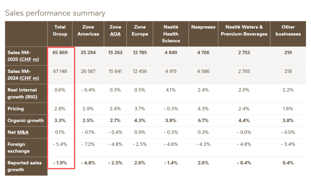 10月16日,雀巢集团发布2025年前9个月财报。数据显示,雀巢集团前9个月的总销售额为659亿瑞士法郎,下降1.9%;有机增长(OG)为3.3%,所有区域和全球管理业务均实现正增长;实际内部增长(RIG)增强至0.6%,定价贡献稳定在2.8%。汇率变动产生了5.4%的负面影响,净收购产生了0.1%的正面影响。