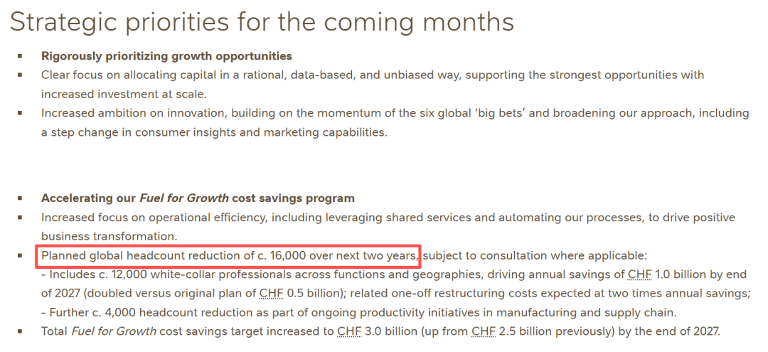 同时,雀巢集团提到,未来两年计划全球裁员约16000人,预计到2027年底实现年均10亿瑞士法郎成本节约(较原计划5亿瑞士法郎翻倍)。