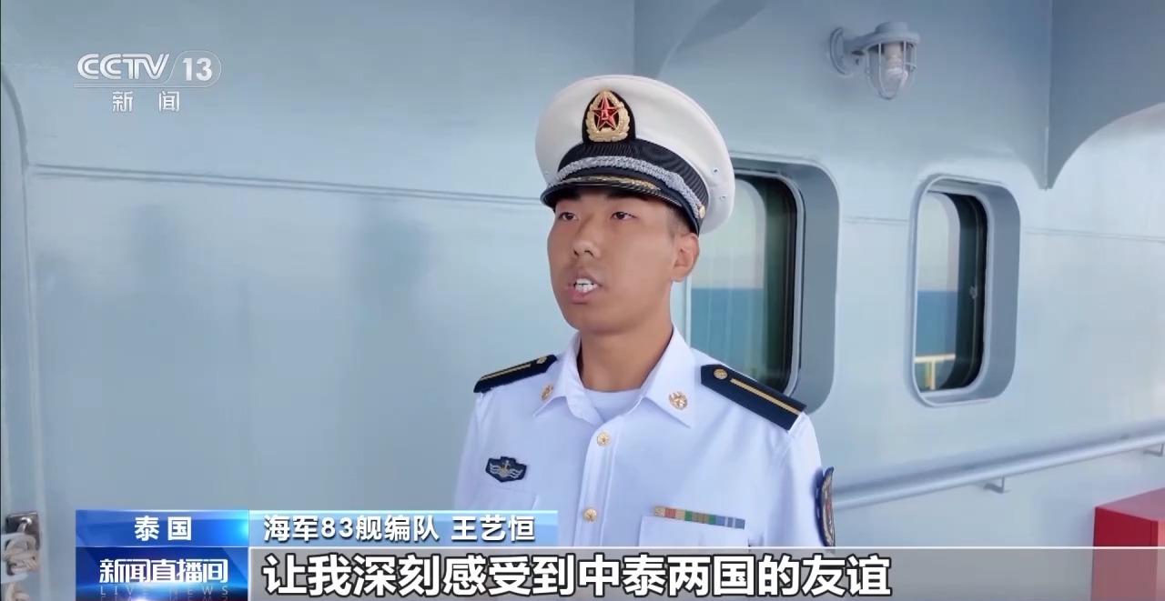 海军83舰编队 王艺恒:今天抵达泰国,现场热烈的欢迎,让我深切感受到中泰两国的友谊,也对两国海军的交流充满期待。接下来,我将和战友们一起,以最佳状态展现中国海军的风采,为传递和平理念贡献我们的青春力量。