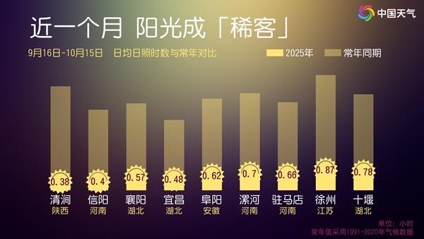 像是河南信阳、驻马店、漯河、周口、商丘、南阳,湖北襄阳、十堰,安徽阜阳、宿州、亳州、淮北、六安、蚌埠,江苏徐州,山东济宁、菏泽均刷新同期日照时数最少纪录。