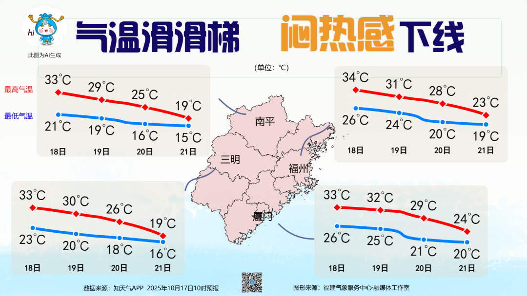 气温方面,下周闷热即将下线,秋风起,寒意浓,添衣保暖正当时,福建省迎来明显降温过程,大部城区日最高气温20日起明显下降,过程最大降温幅度10~14℃。22日前后降至18~24℃,气温骤降让人措手不及,尤其是早晚温差进一步增大,清晨和夜晚寒意袭人,在这样的天气里,朋友们需根据气温变化适时调整着装,及时增添衣物,尤其是老人、儿童和体质较弱者更应注意保暖,避免着凉感冒。