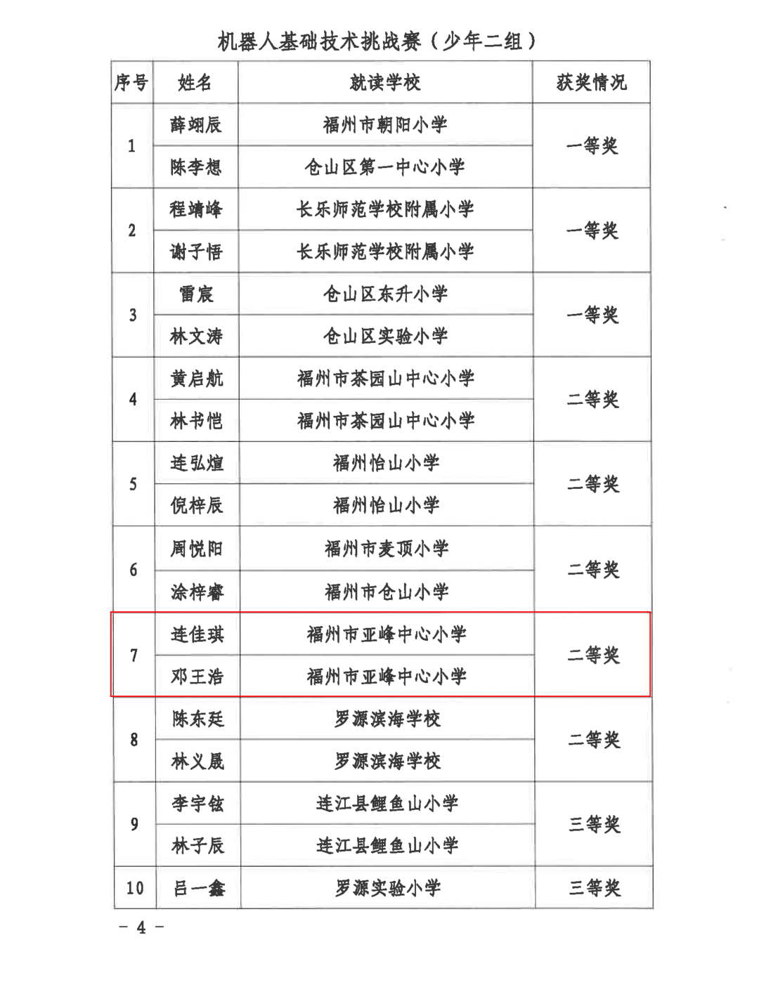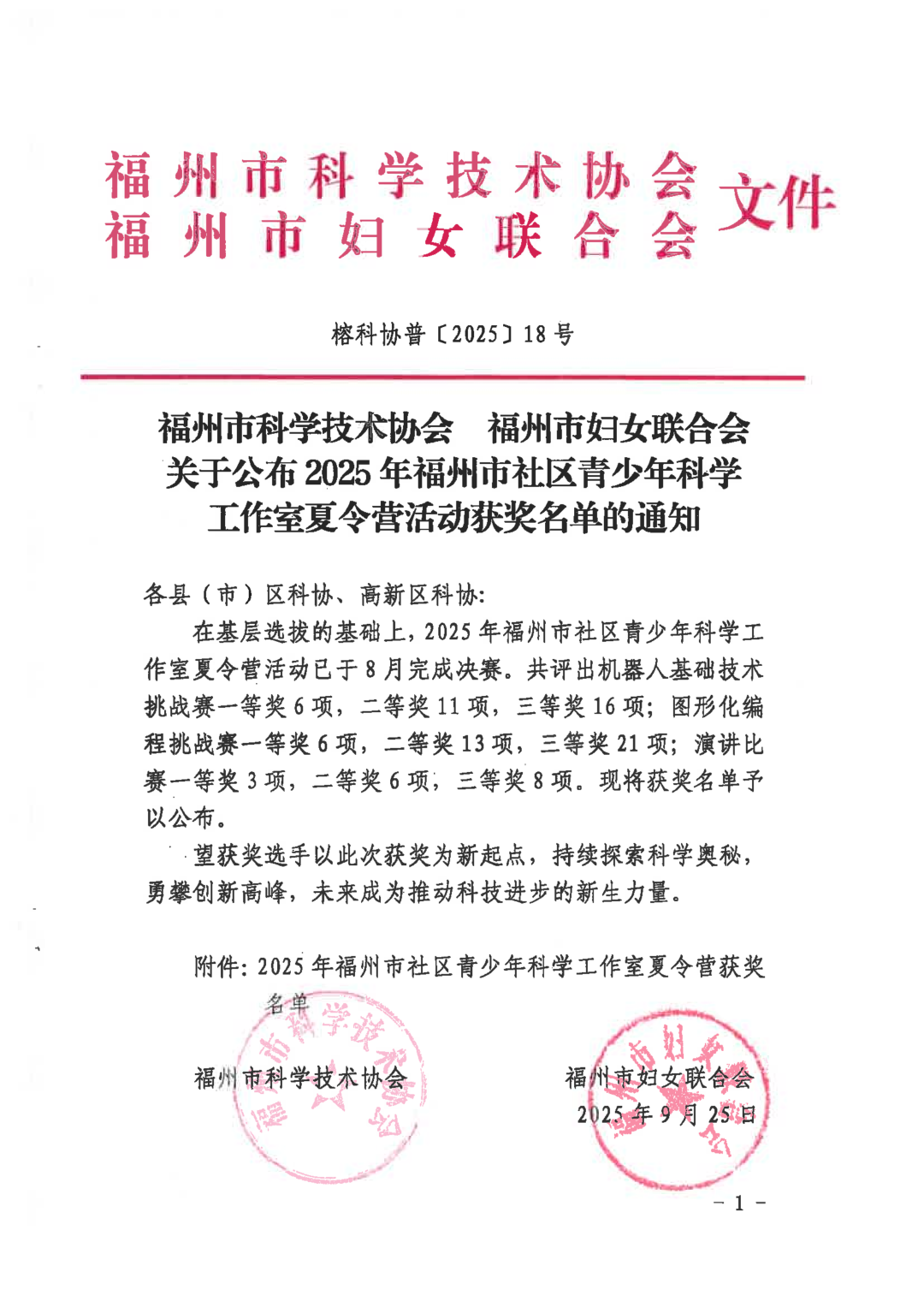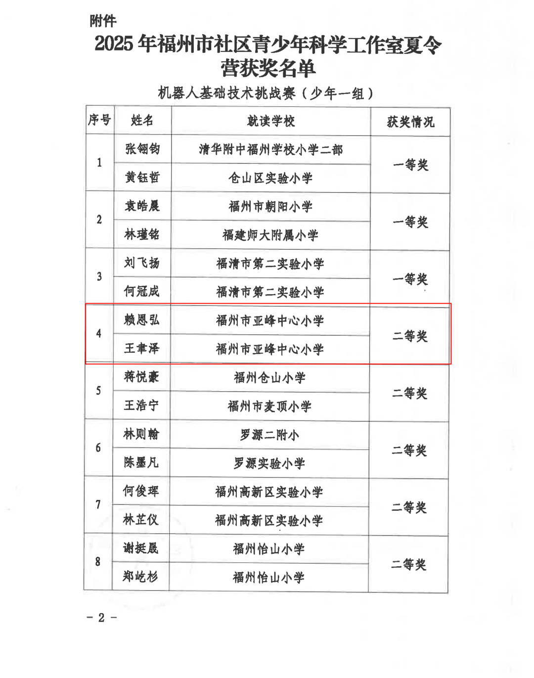 近日,由福州市科学技术协会、福州市妇女联合会主办的2025年福州市社区青少年科学工作室夏令营活动获取名单已出!共评出机器人基础技术挑战赛一等奖6项,二等奖11项,三等奖16项;图形化编程挑战赛一等奖6项,二等奖13项,三等奖21项;演讲比赛一等奖3项,二等奖6项,三等奖8项。台江区福州市亚峰中心小学学生荣获多个奖项!