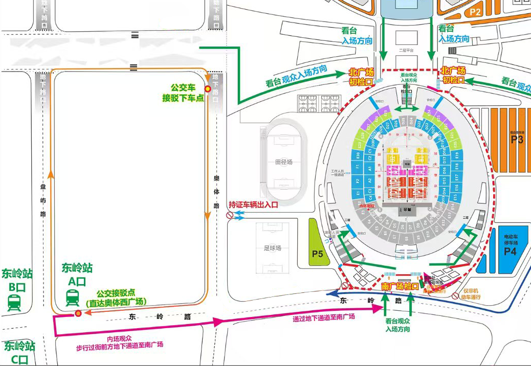 由A、B、C出站,均可步行至体育场,A口、看台观众可乘坐接驳车前往体育场北广场入场。
