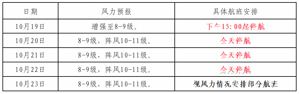 根据10月18日发布的气象预报,受冷空气和台风共同影响,湄洲岛海域自10月19日至23日有9级以上阵风,现将忠湄轮渡近日停航信息通告如下:
