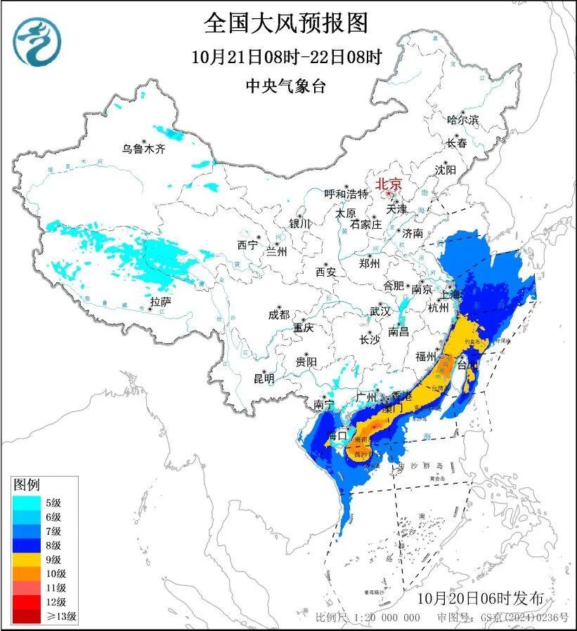 大风预报:受冷空气和“风神”的共同影响,20日14时至21日14时——台湾海峡、巴士海峡、南海北部和中部、东沙群岛、西沙群岛、中沙群岛及黄岩岛附近海域、北部湾、琼州海峡、东海、黄海、渤海海峡以及山东半岛沿海、江苏沿海、上海沿海、长江口区、杭州湾、浙江沿海、台湾沿海、福建沿海、广东沿海、广西沿海、海南岛沿海将有6—8级大风,阵风9—10级。