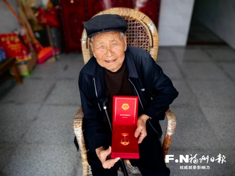 110岁的叶光友老人笑着向记者展示“光荣在党50年”纪念章。记者 潘温祥摄