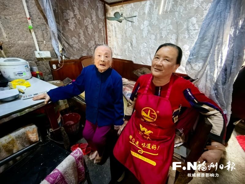 110岁的陈龙金老人(左)和儿媳在一起。记者 潘温祥摄