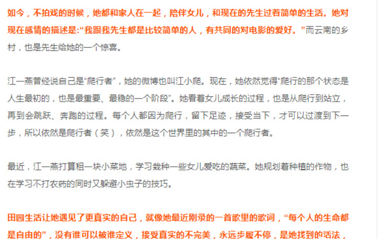 在大理生活的这几年,江一燕想清楚了一些事情。她曾说自己的价值观是“安忍无辩”,但现在她觉得还是可以变一变的,“我觉得与其去争辩不如改变自己,如果我可以做得更好,那我就去做,如果不行那就算了,没有必要一定要去争论个对错。以前感性多一些,现在感性和理智都会有。40岁了,也该要理智了。”江一燕表示。(来源 北京日报、越牛新闻、宁波晚报)
