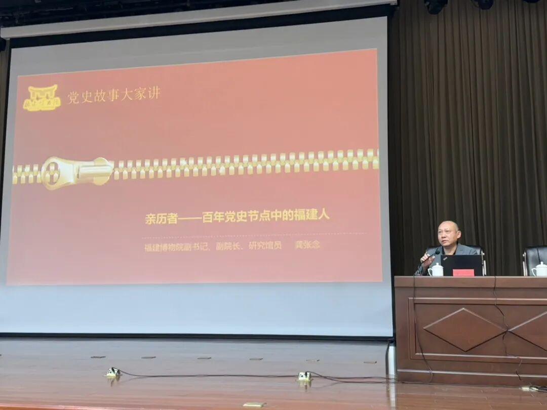本次活动特邀福建博物院副书记、副院长、研究馆员龚张念老师作《亲历者——百年党史节点中的福建人》专题授课。龚副书记以1840年鸦片战争为历史切入点,系统梳理了“旧民主主义革命”“新民主主义革命”“社会主义革命和建设”“改革开放和社会主义现代化建设”“新时代中国特色社会主义”五个专题,结合自身研究与感悟,生动讲述了百年来福建人“向海而生”“敢为天下先”的奋斗精神及其在党史关键节点上所发挥的重要作用与卓越贡献,深刻阐释了福建人民助力中华民族伟大复兴的历史足迹。