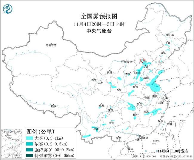 中央气象台11月4日18时发布大雾黄色预警:预计,11月4日夜间至5日上午,北京大部、天津、河北中南部、河南北部、山东北部和东部、江苏中北部、湖南北部、江西中部、浙江西南部、福建西北部、云南中部等地的部分地区有大雾,局地有能见度不足500米的浓雾。